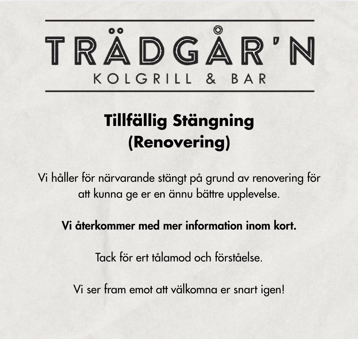 Varmt välkommen till Trädgår’n Kolgrill & Bar!